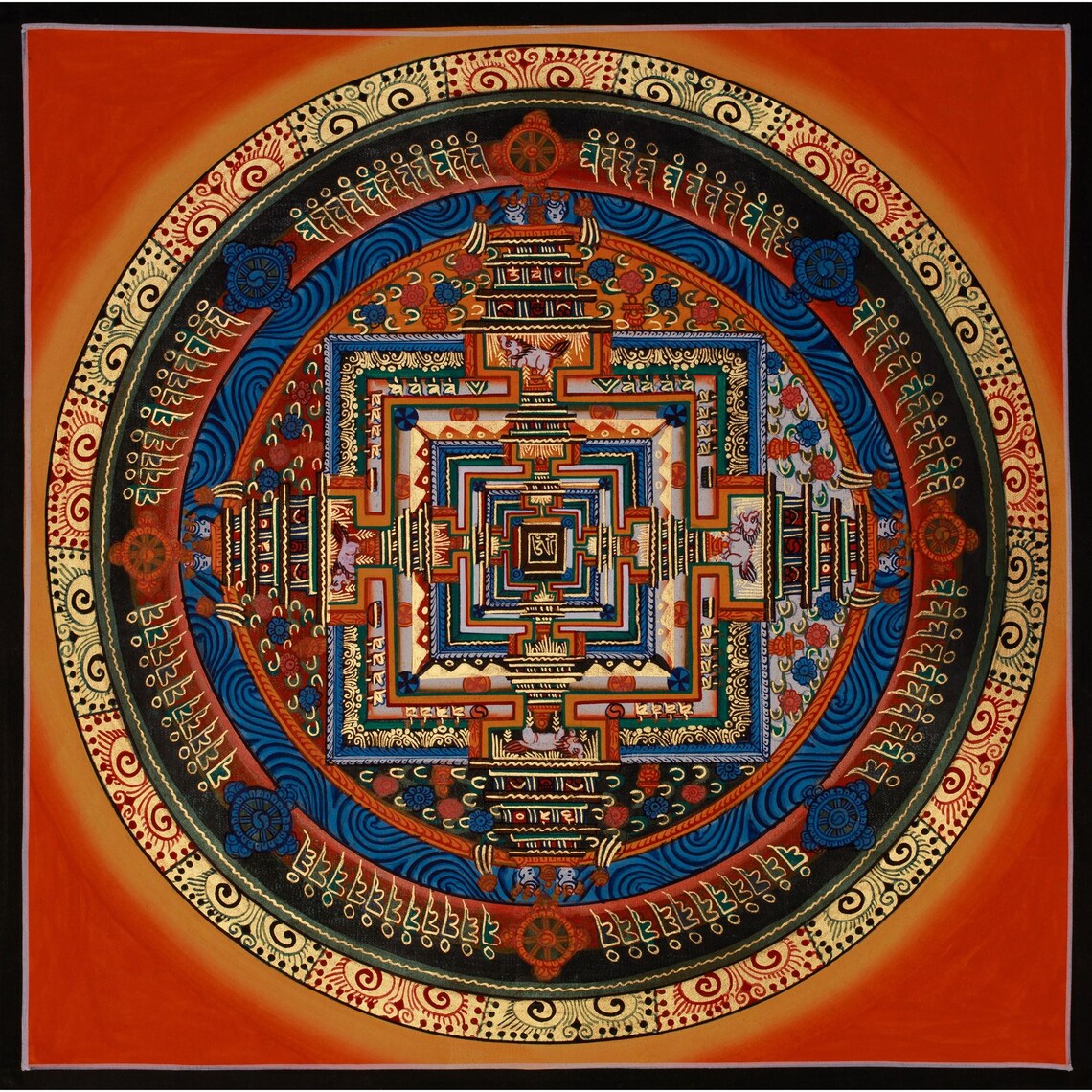 The Kalachakra mandala shown here is a two-dimensional depiction of an actual multi-leveled structure, shaped like a pyramid. Each level of the mandala corresponds both to a physical part of this divine palace and to a quality of the enlightened mind. The outermost square—the first and lowest level—symbolizes the enlightened body and its activities. The second level represents enlightened speech, the third corresponds to the enlightened mind, and the innermost and highest level symbolizes fully awakened wisdom.