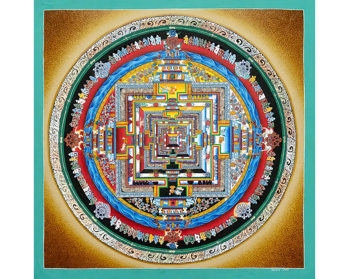 At the pinnacle of the mandala stands the deity Kalachakra, in union with his consort Vishvamata. Kalachakra—depicted here with a blue body, multiple arms, legs, and faces—is the central figure practitioners identify with during Kalachakra Tantra practice.